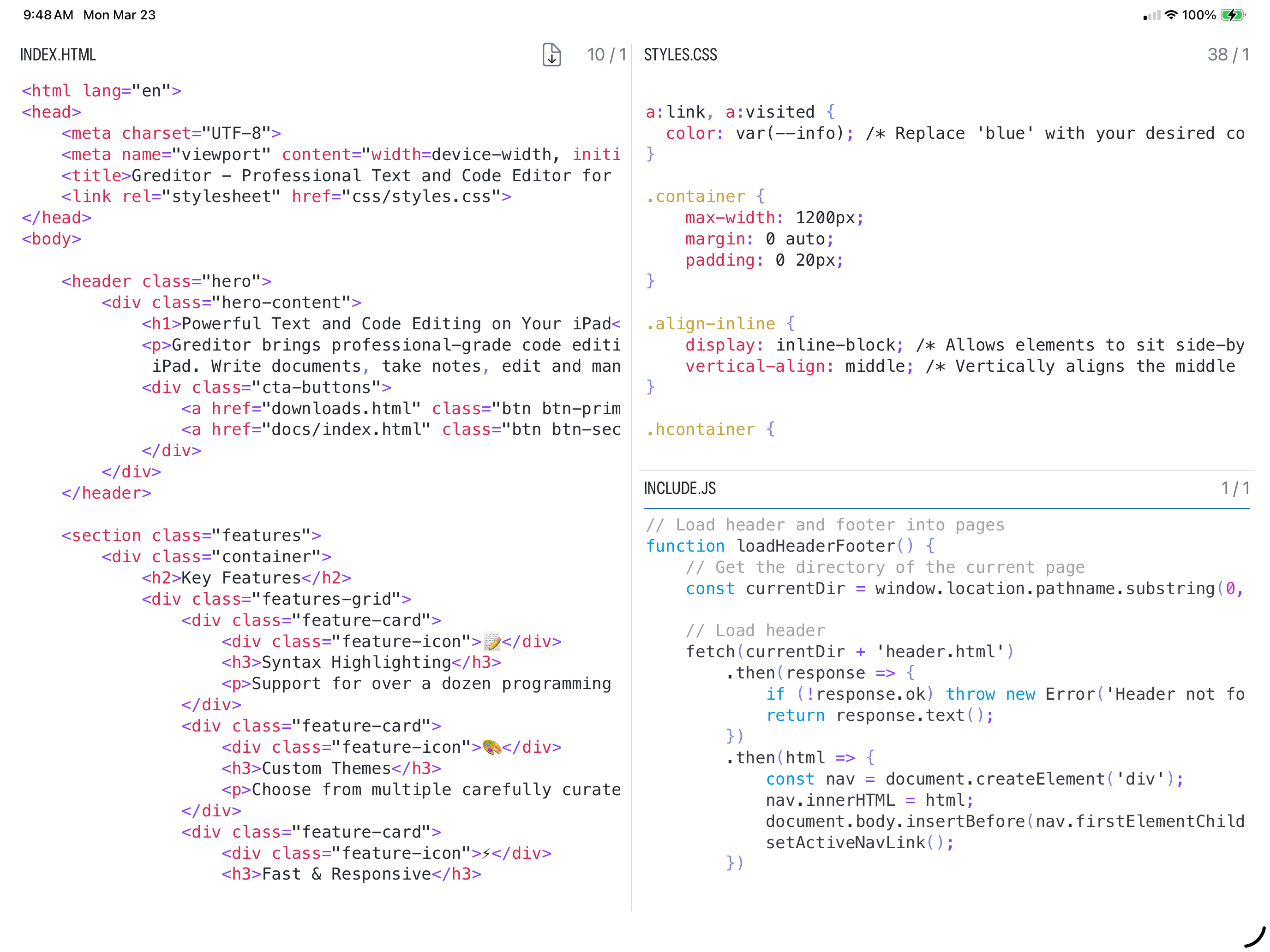 Greditor brings professional-grade code editing capabilities to your iPad. Write documents, take notes, edit and manage your development files on the go.